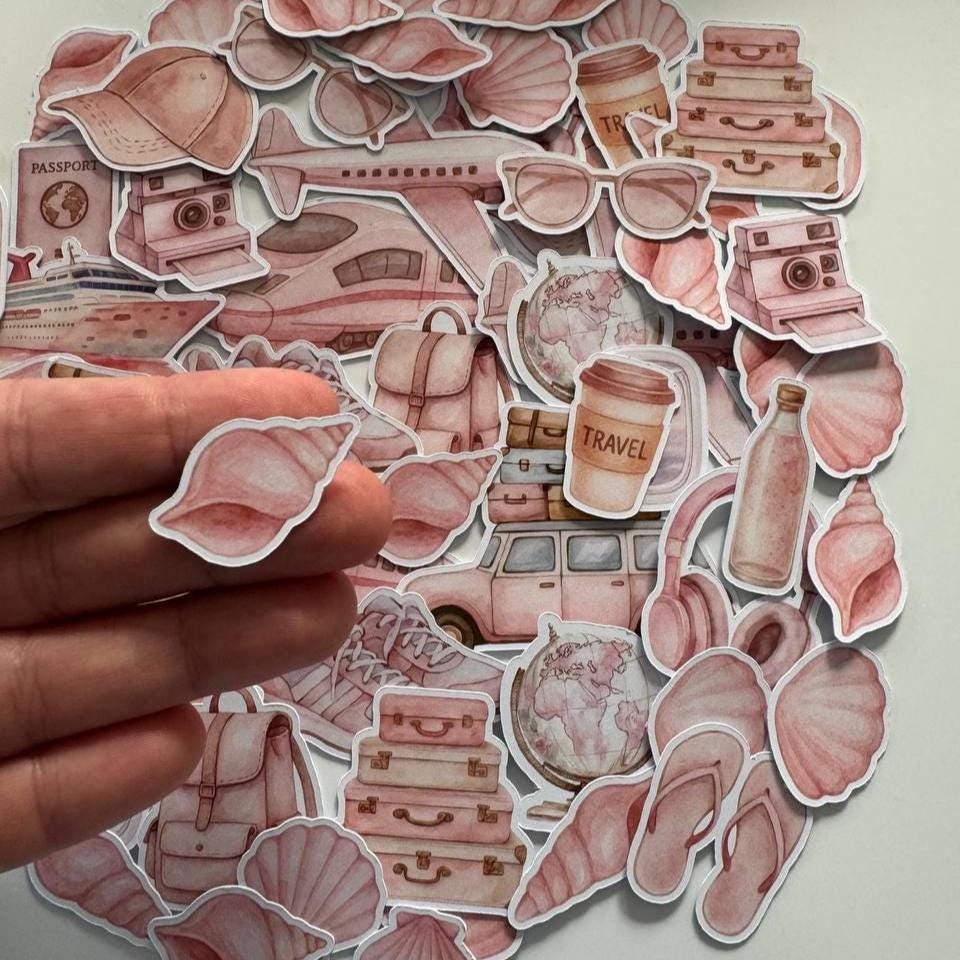 This set includes 60 pieces of beautifully illustrated travel-themed elements — suitcases, airplanes, cameras, shells, backpacks, and coffee cups — all in soft pastel pink tones. Perfect for journaling, scrapbooking, cardmaking, or decorating travel albums.