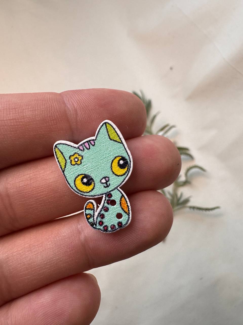 A charming wooden decorative button featuring a cute hand-painted cat design. Made from natural wood, this button is lightweight, smooth to the touch and ideal for creative use.